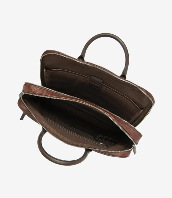 Westminster Briefcase, made from grain calf tanned leather. Featuring a detachable shoulder strap and single internal zip pocket. Made in India.